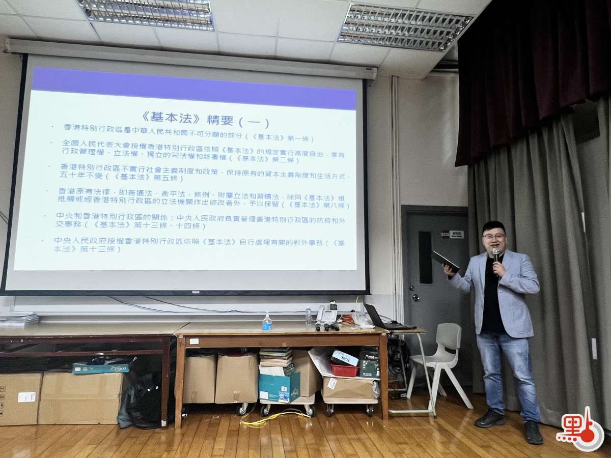 王俊傑向同學們傳達:憲法是國家的根本大法,規定了國家體制、政權組織、政府架構、公民的基本權利和義務,在國家整個法律體系中處於最高的法律位階;香港特別行政區乃根據憲法而設立,基本法和「一國兩制」的確立也是以憲法為根本依據;基本法亦闡明了中央與香港的關係、香港所實施的制度。在權利方面,香港有行政、立法、司法權和終審權;王俊傑提點同學們留意,香港是高度自治,不是「完全自治」,例如國防、外交,就不是香港自治範疇。