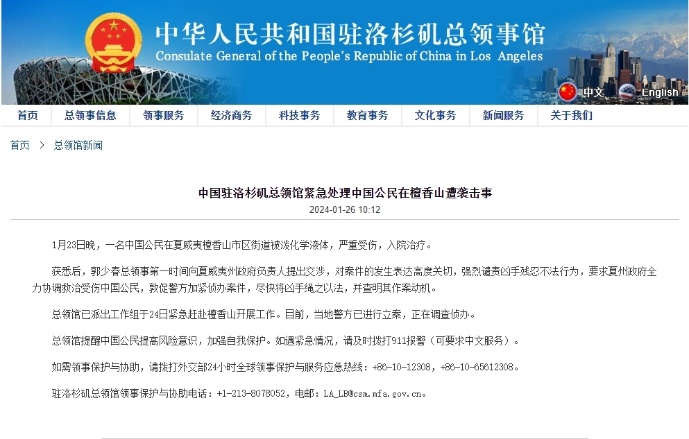 【點新聞報道】據中國駐洛杉磯總領館公眾號消息,1月23日晚,一名中國公民在夏威夷檀香山市區街道被潑化學液體,嚴重受傷,入院治療。