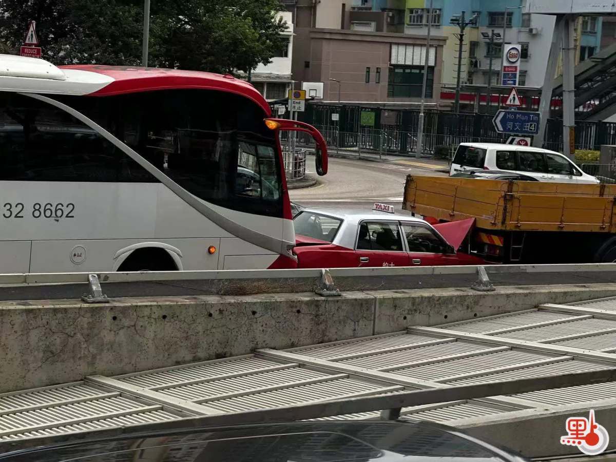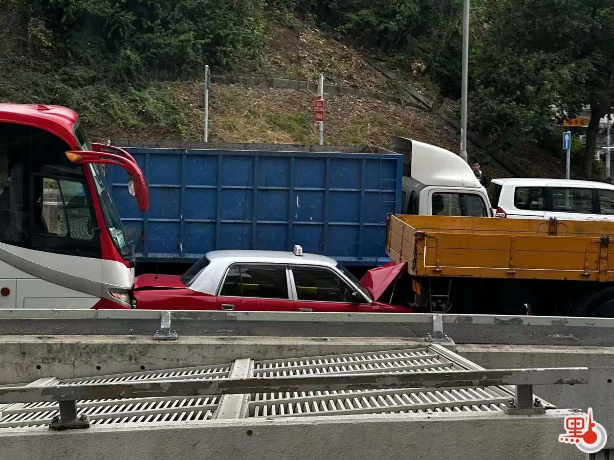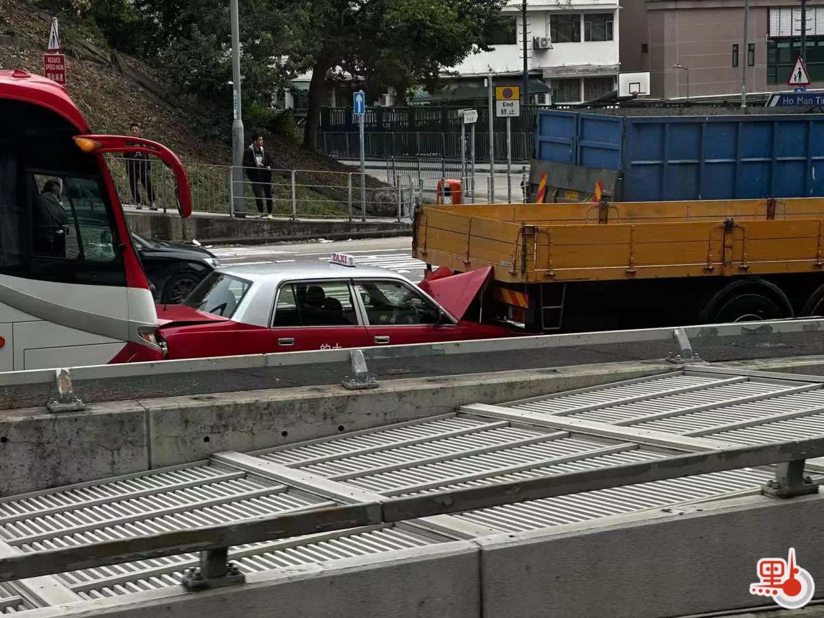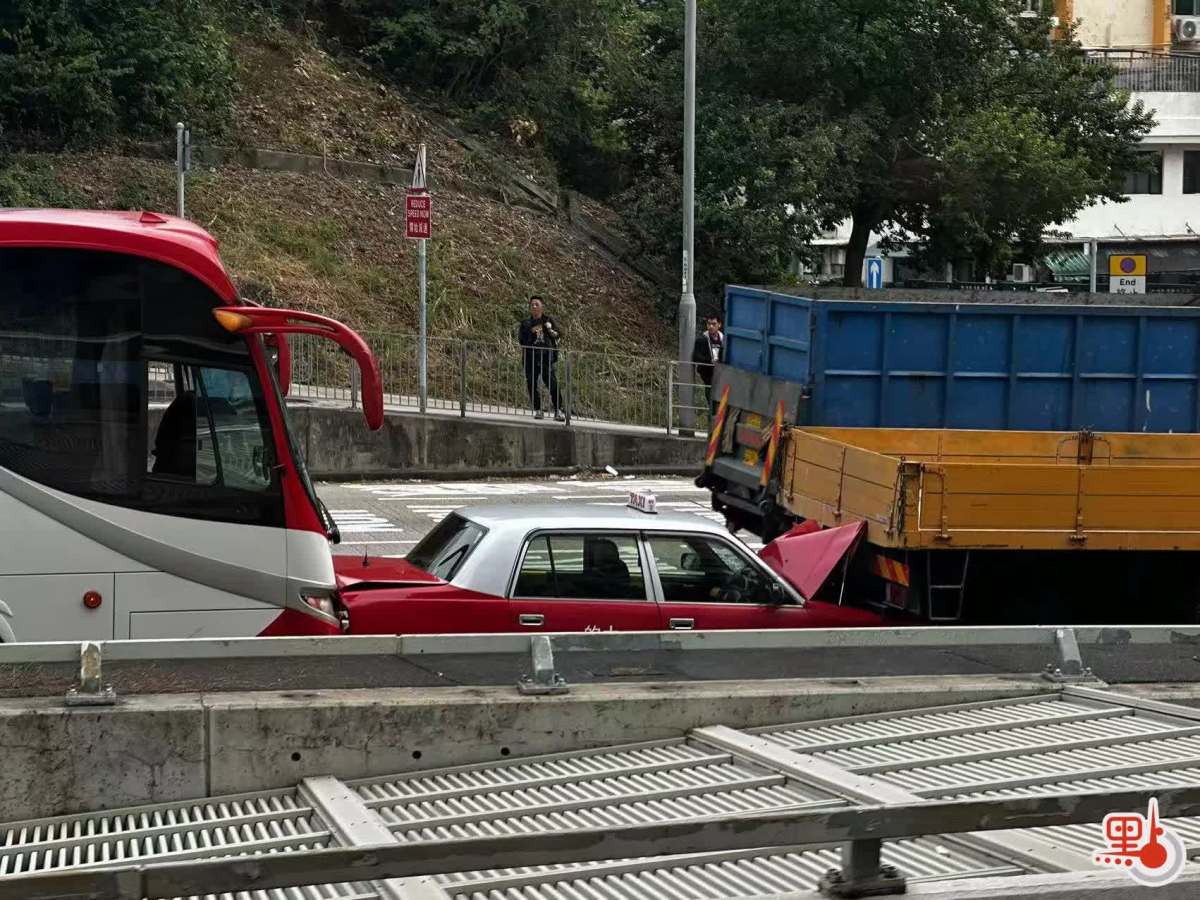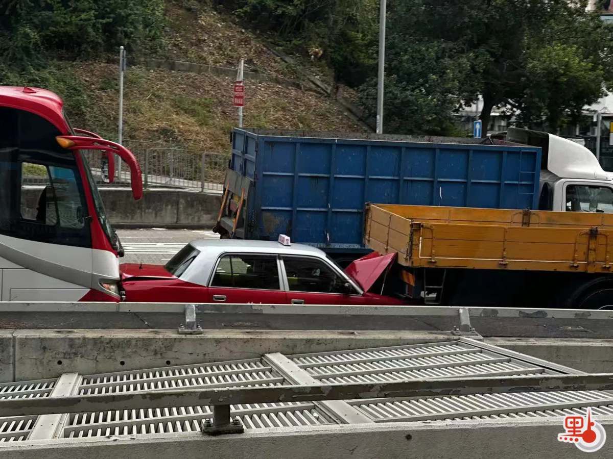 點新聞記者今日(27日)下午在現場見到,漆咸道北往紅隧方向近山谷道處,一輛貨車、一輛的士、一輛大巴連環相撞,的士夾在中間受損較嚴重,車身引擎蓋及車尾箱均變形翹起,現場交通一度受阻。