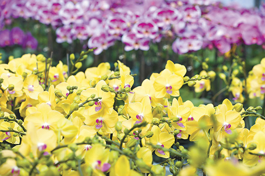 在楊小龍位於八鄉的花場內,有不同品種嬌艷的蝴蝶蘭,認真「花多眼亂」。楊小龍在接受香港文匯報訪問時介紹,今年有5種新品及特別品種,分別為「巨星」、「全家福」、「大粉紅」、「大財主」、以及「豬龍入水」,預計都會大賣。