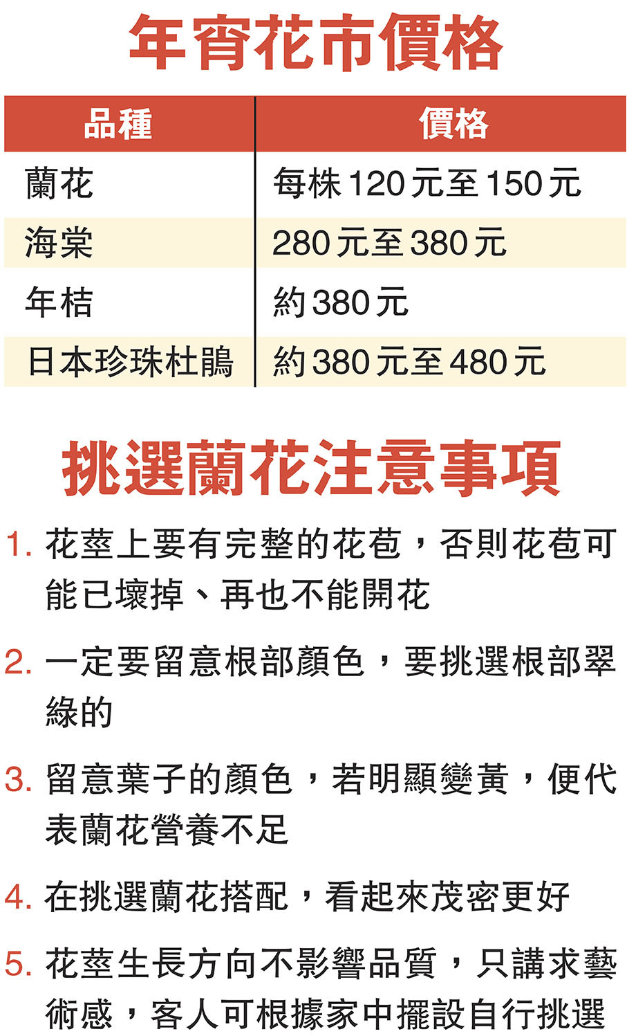 在花墟開店的張女士表示,雖然運輸成本上升,但售價不會調整,「不為賺錢,就為一個好氣氛。」她介紹,在年宵市場推出的「四大花寶」,蘭花以一株138元售賣,海棠約為280元至380元,十吋的年桔為380元,「若是再大一點的,需要580元。」