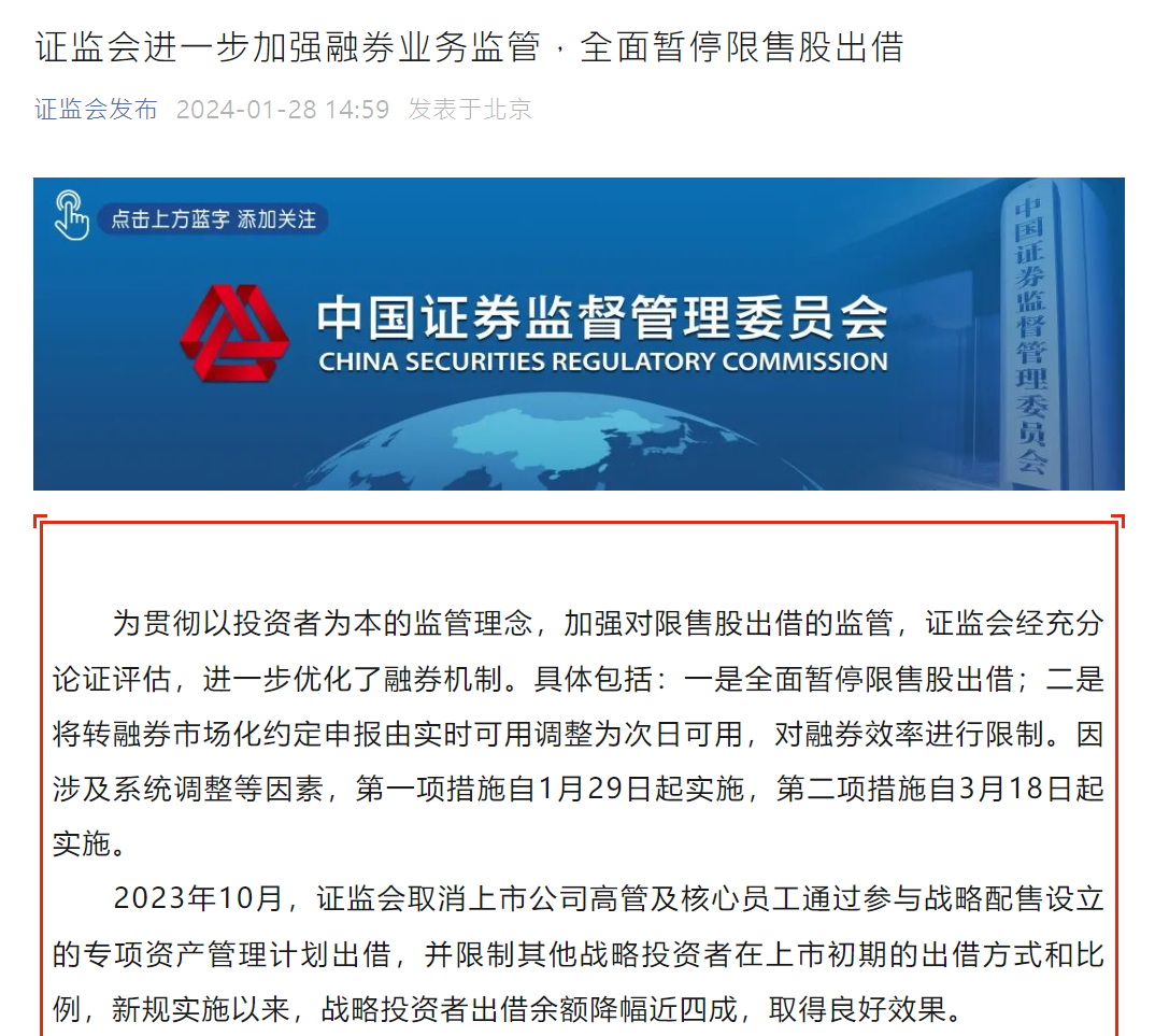 【點新聞報道】根據證監會1月28日最新發布消息,對現行兩融規則進行兩項調整:一是全面暫停限售股融券出借,並將於1月29日起實施;二是將轉融券市場化約定申報由實時可用調整為次日可用,對融券效率進行限制,將在今年3月18日起實施。