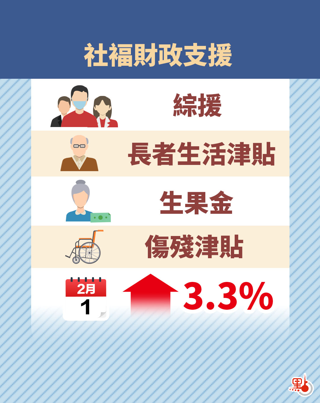社署發言人表示,立法會財務委員會去年12月8日批准政府按既定機制,以社會保障援助物價指數的按年變動為基礎,把上述各項金額調高3.3%,由今年2月1日起生效。上述調整共惠及約150萬人。