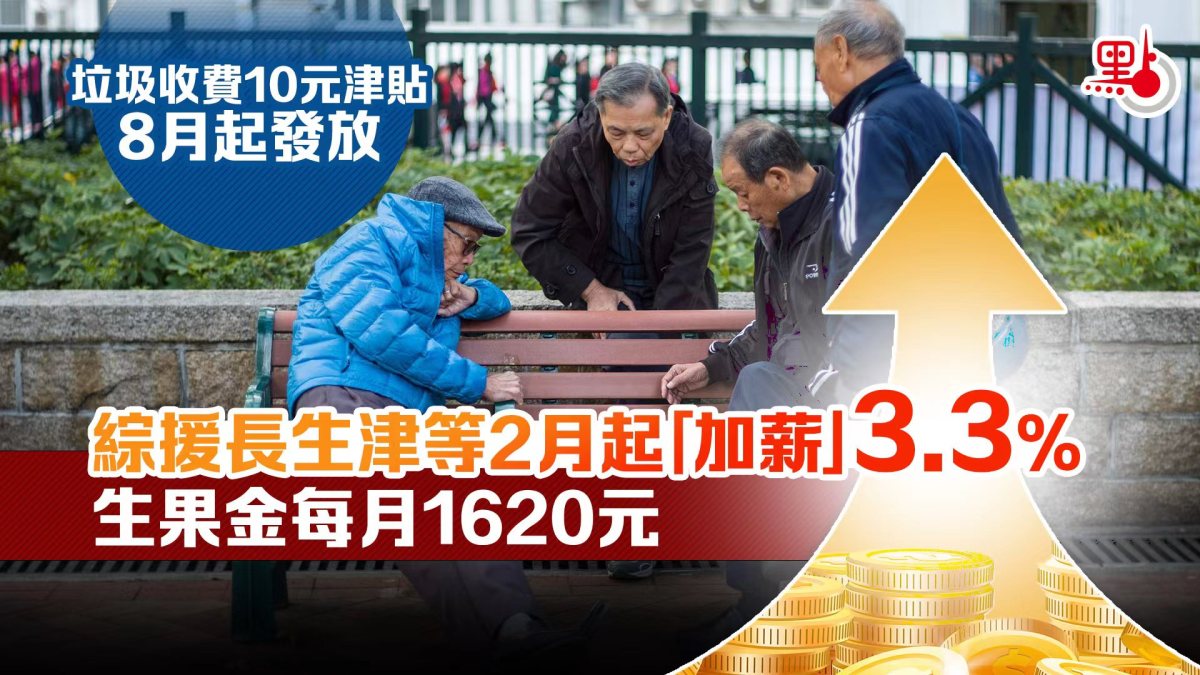 經調整後,每月綜援標準金額,單身長者4195元(原4060元)、成人3200元(原3100元)。至於每月公共福利金,俗稱生果金的高齡津貼為1620元(原1570元)、長者生活津貼4195元(原4060元)、普通傷殘津貼2070元(原2005元)、高額傷殘津貼4140元(原4010元)。另外,為配合都市固體廢物收費(垃圾收費)的實施,立法會財務委員會批准向綜援受助人及長者生活津貼受惠人每人每月發放10元津貼,由8月1日起生效。
