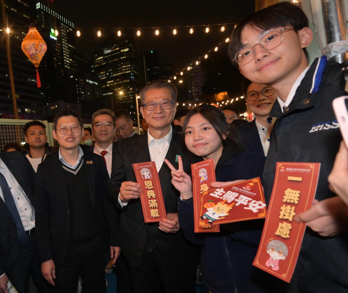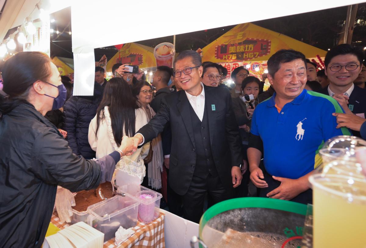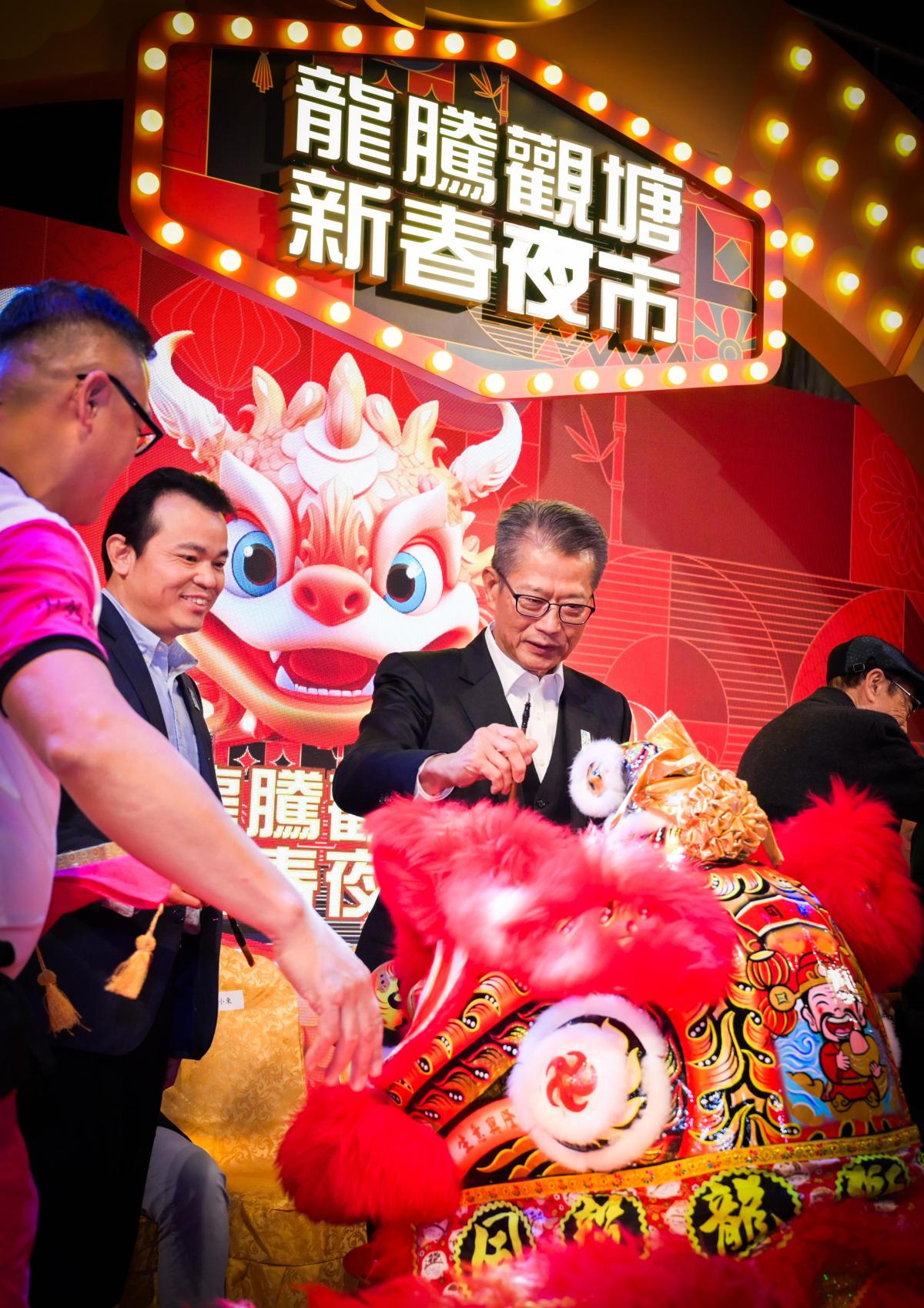 陳茂波表示,香港是一個多元開放的大都會,而香港的18區,亦各自擁有豐富的文化和旅遊資源,可謂「區區有睇頭」。承接之前「香港夜繽紛」的良好勢頭,政府正陸續推出「18區日夜都繽紛」活動,內容多元精彩,包括特色市集、綵燈會、夜光活動、藝墟,以至時尚節和賞花活動等,讓「區區都精彩」。今日的龍騰夜巿就是其中一項頭炮活動,一直辦到年初七。他感謝民政事務總署和18區民政事務處籌辦這一系列活動,讓市民在自己的社區就有更多食、買、玩的好去處,一起開心消費和辦年貨。