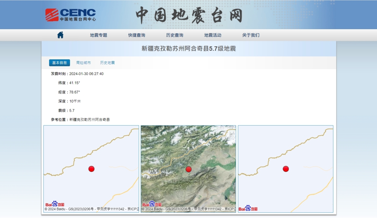 【點新聞報道】新疆克孜勒蘇州阿合奇縣今(30日)早6時27分發生5.7級地震,目前暫無人員傷亡報告。