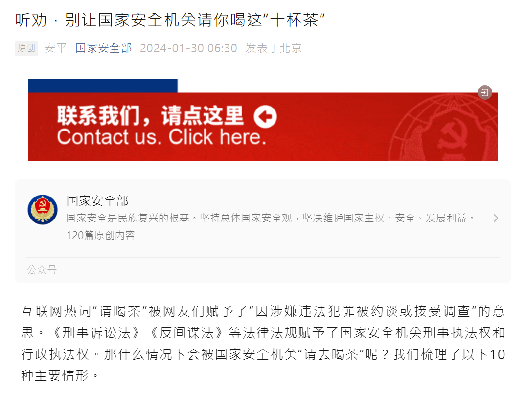 【點新聞報道】據「國家安全部」微信公眾號1月30日消息,互聯網熱詞「請喝茶」被網友們賦予了「因涉嫌違法犯罪被約談或接受調查」的意思。《刑事訴訟法》《反間諜法》等法律法規賦予了國家安全機關刑事執法權和行政執法權。那什麼情況下會被國家安全機關「請去喝茶」呢?我們梳理了以下10種主要情形。