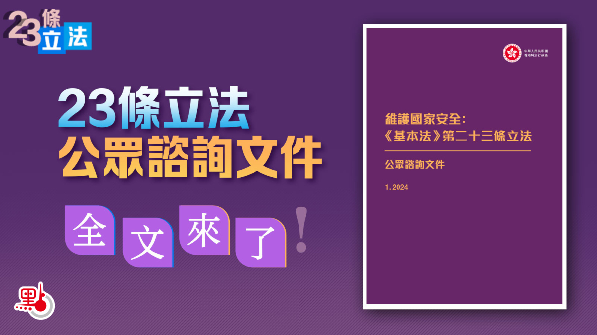 【點新聞報道】行政長官李家超今日(30日)上午10時在政府總部主持「維護國家安全:基本法第23條立法公眾諮詢」記者會。李家超宣布,政府今日展開基本法第23條立法公眾諮詢,諮詢文件已在保安局網頁公布,印製好的文本亦會在指定地點派發給市民取閱。另外,政府會舉行多場講解,除向本地市民解說外,亦會針對外國領事、外國商會等做出解說。諮詢期為1個月,歡迎市民由今日起至2月28日提供意見。