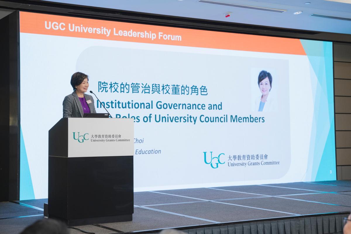 論壇上,教育局局長蔡若蓮等就院校管治及發展香港成為國際專上教育樞紐發表主題演講。蔡若蓮表示,特區政府高度重視對教育的投資,香港高等教育的質素更是享譽全球,目前是全球唯一擁有五所百強大學的城市。高等教育的出色表現,原因很多,最近外訪,與國外高等教育界朋友交流時,他們都非常羨慕香港的大學有政府在財政上的大力支持;有穩定的發展環境、匯聚不少精英人才來港升學和進行研究;在基本法保障下,院校享有學術自由,在管治上高度自主;專家治校、自由開放都是香港高等教育的獨特優勢。