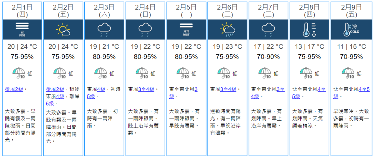 展望未來一兩日潮濕有霧,日間溫暖。星期六風勢較大。下周初仍然潮濕。農曆新年前氣溫顯著下降。