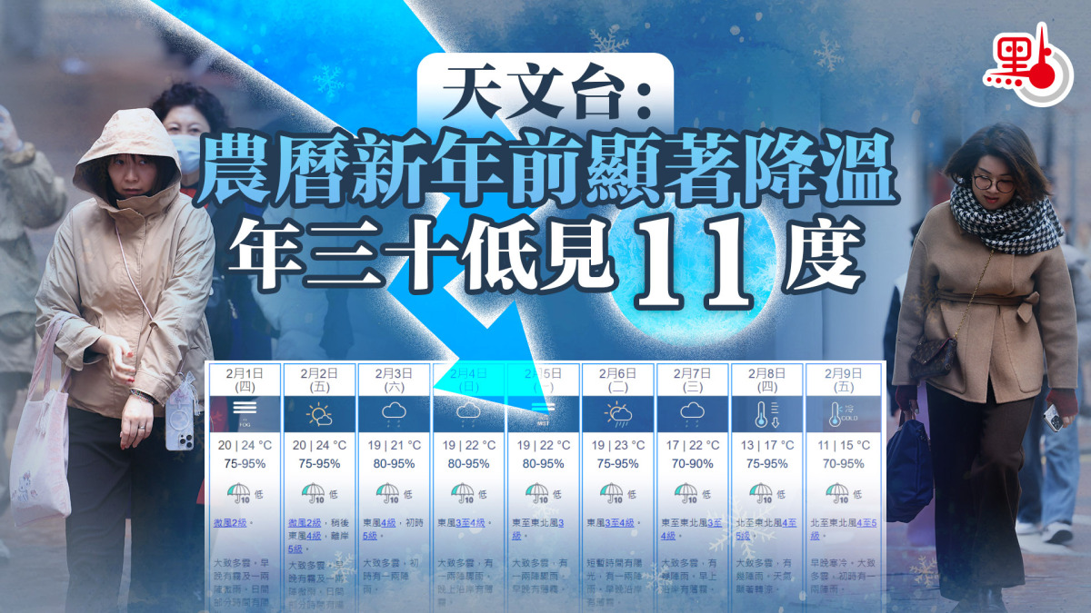 據未來九日天氣預測,年廿九(8日)氣溫跌穿20度,介乎13至17度,相對濕度75至95%,有幾陣雨,天氣顯著轉涼。年三十(9日)溫度進一步跌到11至15度,相對濕度70至95%,早晚寒冷,大致多雲,初時有一兩陣雨。當晚準備到黃大仙祠等候上頭炷香的善信,要注意天氣。