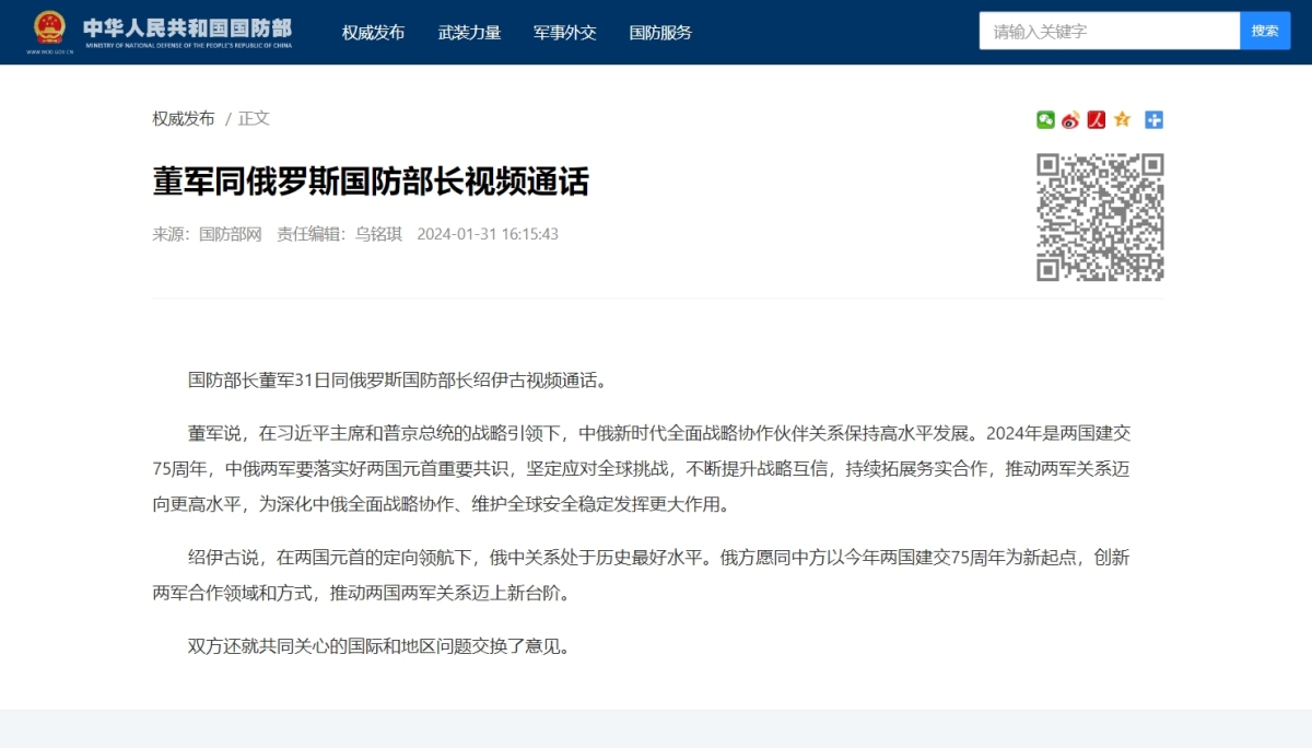 【點新聞報道】據國防部網站消息,國防部長董軍今日(31日)同俄羅斯國防部長紹伊古視頻通話。