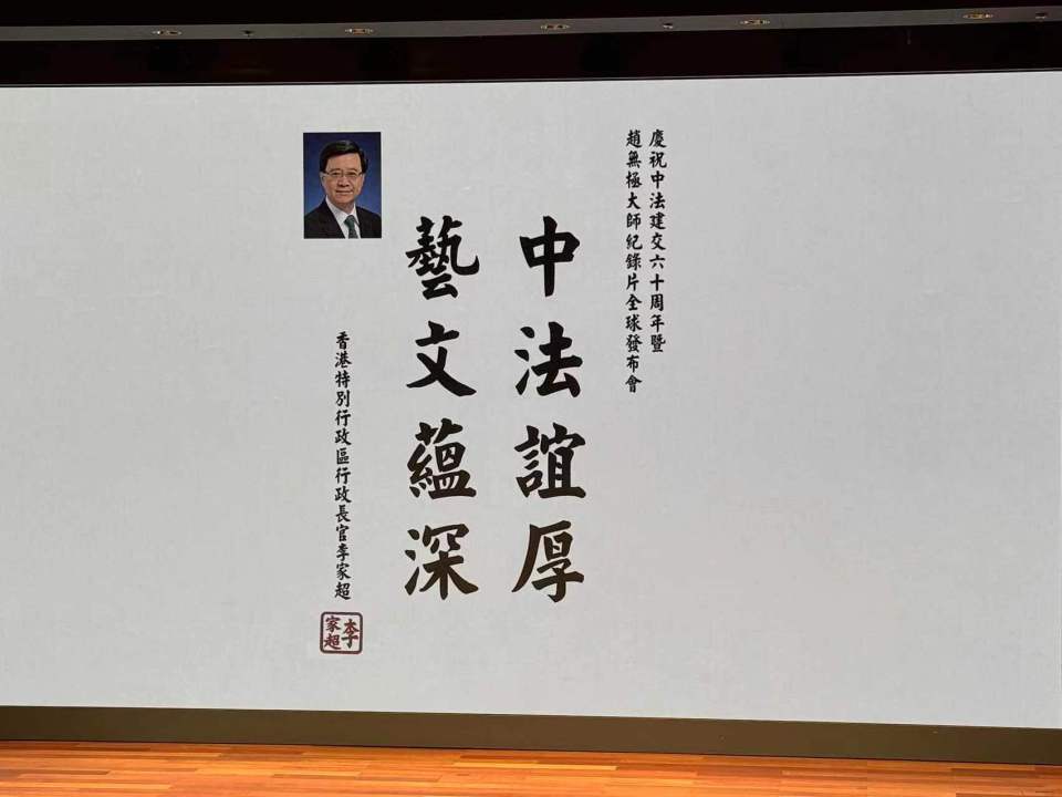 【點新聞報道】今年(2024年)是中國和法國建交60周年,「慶祝中法建交60周年暨趙無極大師紀錄片全球發布會」今日(2日)在香港故宮文化博物館舉行。香港特區行政長官李家超為活動題詞「中法誼厚 藝文蘊深」,彰顯特區政府支持中外文化藝術交流,增進香港國際化特色的決心。