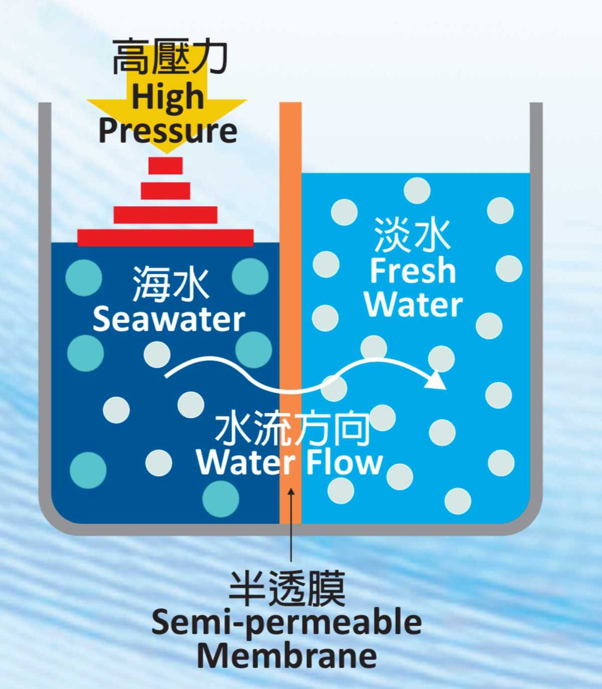 海水化淡的四個主要處理過程為:隔篩、前處理、逆滲透淨化和後處理。首先進行「隔篩」和「前處理」,以防止海洋生物進入設施,並過濾清除雜質和懸浮粒子等,其後利用「逆滲透」技術去除鹽分、雜質和微生物。