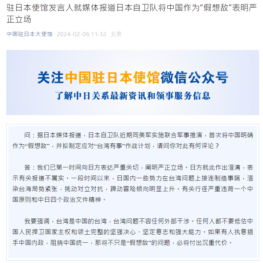 【點新聞報道】據中國駐日本大使館消息,有記者提及,據日本媒體報道,日本自衛隊近期同美軍實施聯合軍事推演,首次將中國明確作為「假想敵」,並擬制定應對「台灣有事」作戰計劃。對此,中國駐日本大使館發言人回應表示,已第一時間向日方表達嚴重關切,闡明嚴正立場。日方就此作出澄清,表示有關報道不屬實。