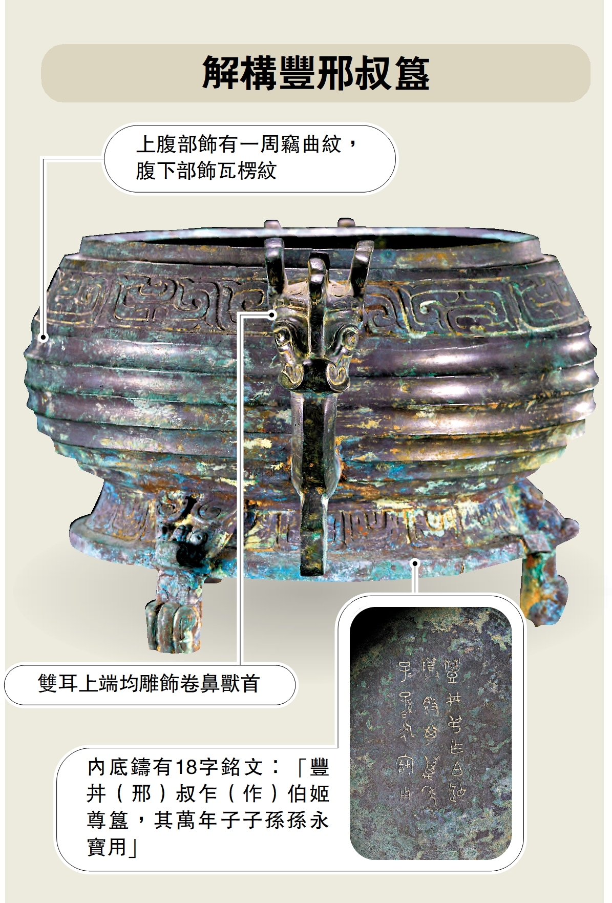 據介紹,豐邢叔簋(粵音軌)於1978年在陝西省寶雞市扶風縣法門鎮一處西周晚期青銅器窖藏出土,通高18厘米,口徑21厘米,腹深12厘米,重6千克。腹鼓,斂口,上腹飾一周竊曲紋,腹下部飾瓦楞紋,圈足下接獸首三扁足,雙耳上端均飾卷鼻獸首,是典型的西周青銅器形制,具有簡潔而莊重的時代風格。此簋內底鑄有銘文3行18字(含重文2個)「豐邢叔作伯姬尊簋,其萬年子子孫孫永寶用」,書法藝術精湛。器物製作工藝反映了西周青銅器高超的鑄造水平。1984年11月被盜,流失海外。