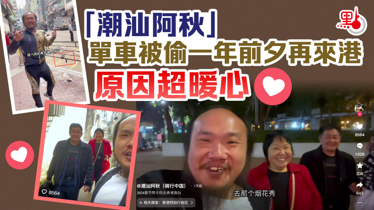 【點新聞報道】有百萬粉絲的抖音內地網紅「潮汕阿秋騎行中國」以踩單車遊歷全國知名。他去年3月來到香港,單車在旺角被偷,引發各界極大關注。不過大年初二(2月11日),阿秋於單車被偷近一年前夕來港。是次阿秋沒有踩單車,而是搭高鐵,偕同父母由故鄉廣州普寧市出發到港。