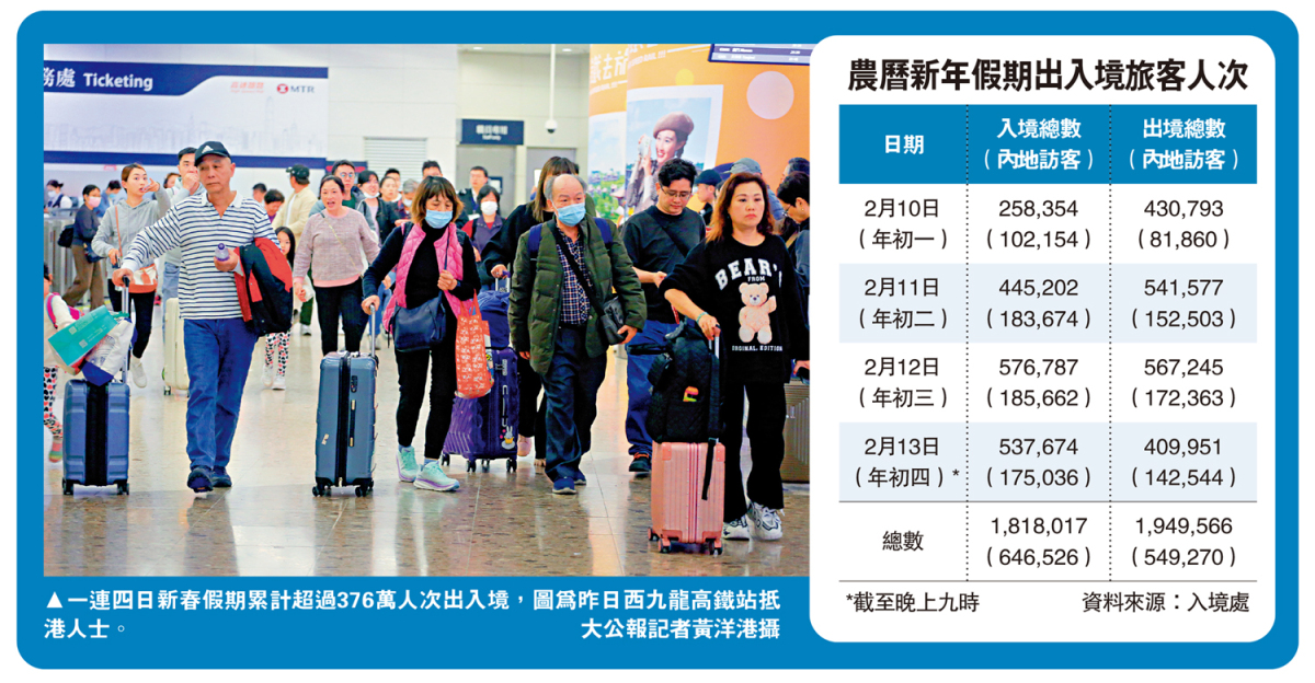 本港一連四日的新春公眾假期昨日結束,截至昨晚九時,累計超過376萬人次出入境,恢復至疫情前水平,當中入境內地旅客有逾64萬人次,每天有200個內地團來港;港珠澳大橋使用量創新高,「港車北上」年初三錄得8000架次。
