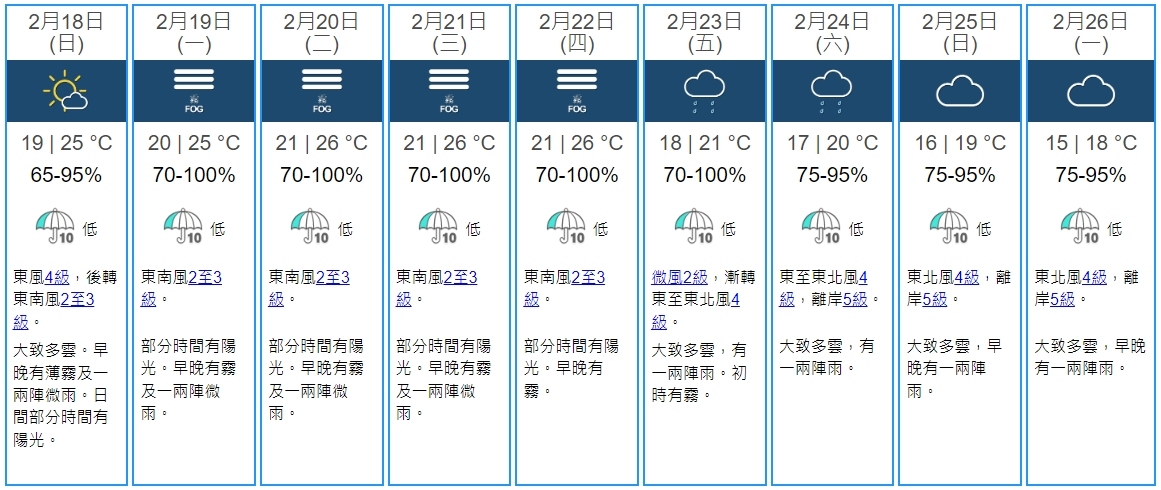 不過,本港下周後期氣溫將急降。天文台預料,下周五(23日)最低氣溫料為18度,與前一日最高溫26度相比,一夜跌了8度。隨後幾日氣溫進一步下跌,預料2月26日星期一最低氣溫僅15度。