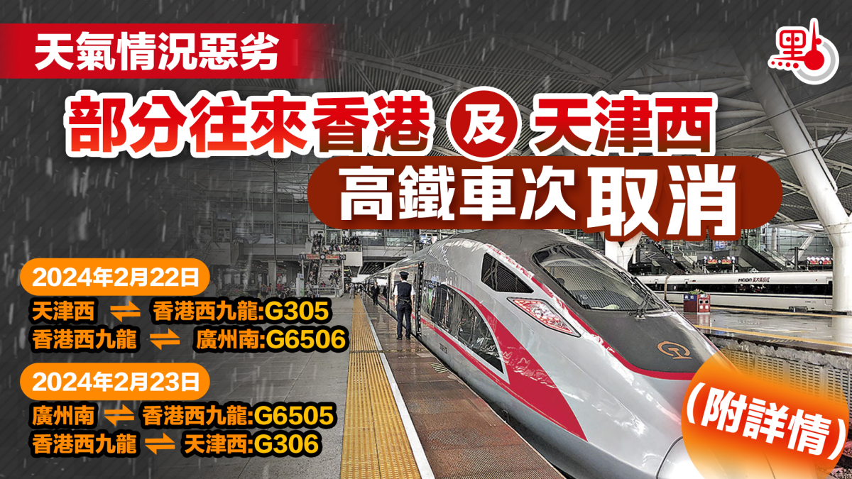 【點新聞報道】據運輸署今日(22日)消息,內地鐵路單位通報,由於天氣情況惡劣,部分來往香港西九龍站及天津西的高速鐵路列車車次取消。