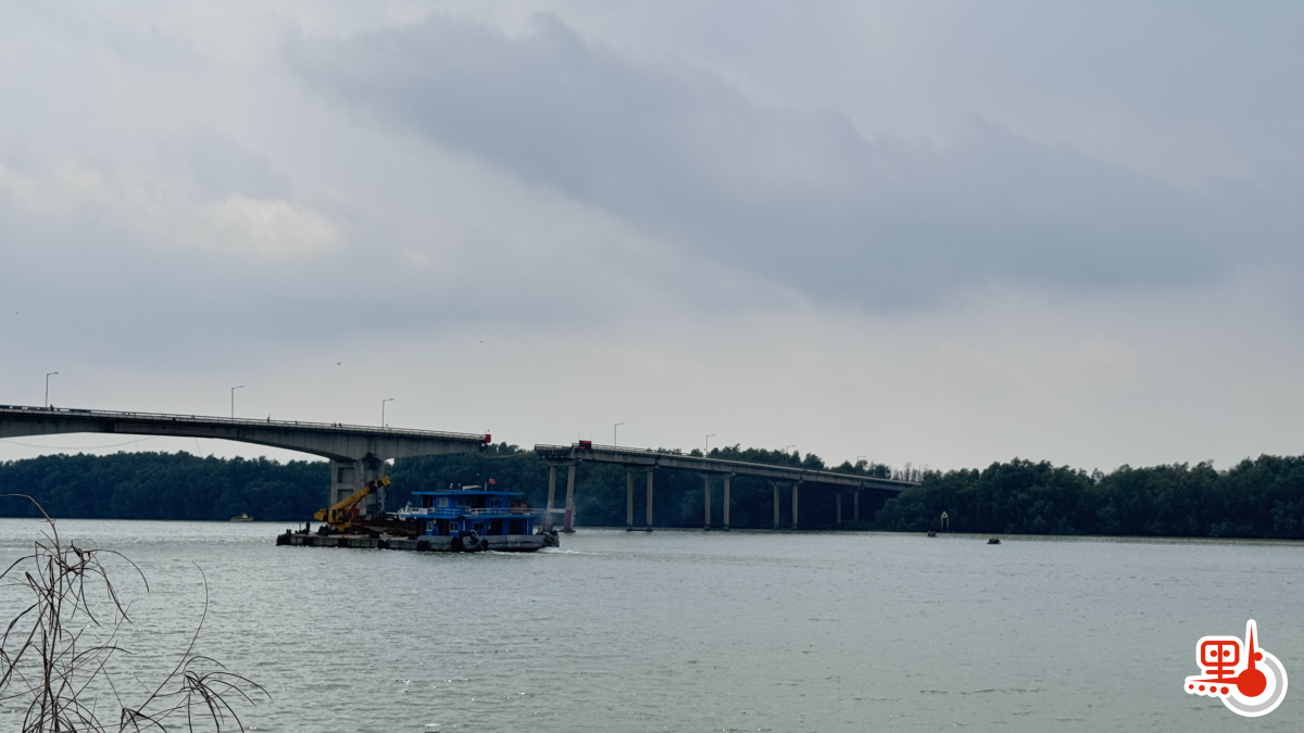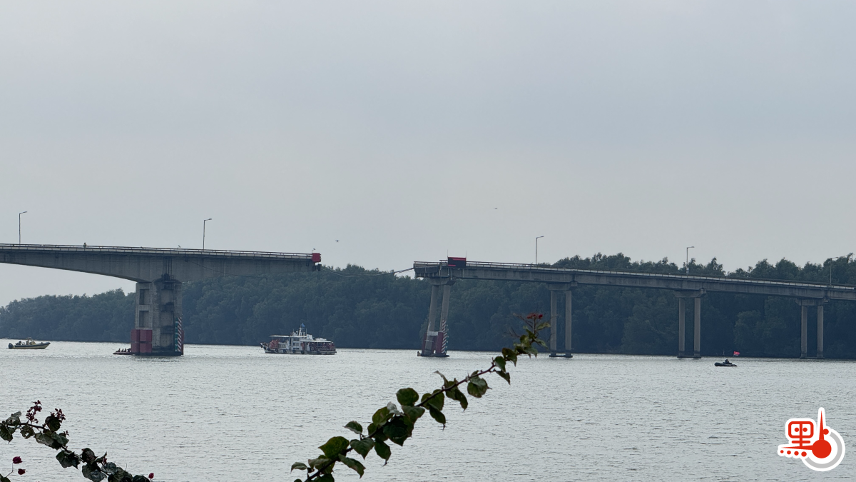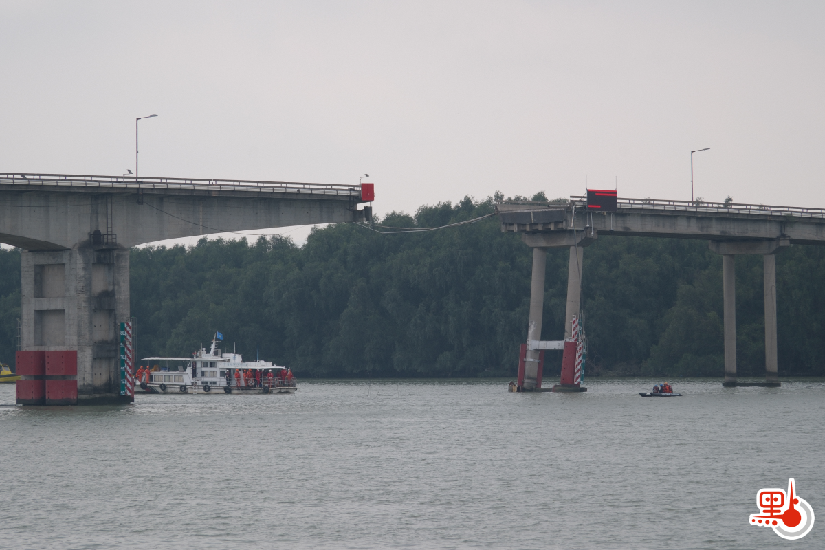 (有片+多圖)現場直擊!瀝心沙大橋涉事船已被拖走 直升機巡邏船持續搜救中