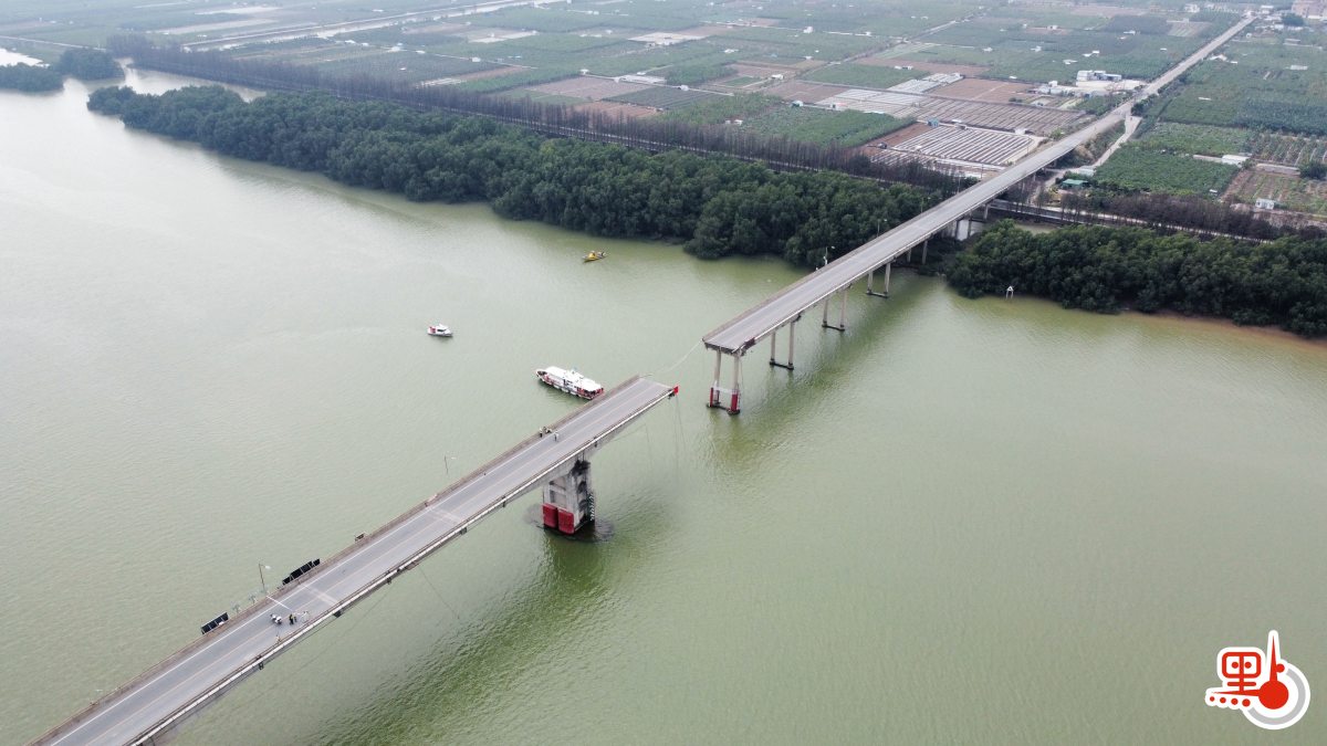2月22日05時30分左右,一艘集裝箱船空載從佛山南海開往廣州南沙途中,航經洪奇瀝水道時觸碰瀝心沙大橋橋墩,致瀝心沙大橋橋面斷裂。(點新聞記者黃寶儀攝)