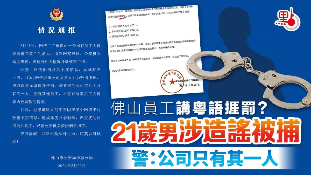 佛山禅城公安指,2月21日,網傳「廣東佛山一公司有員工因講粵語被罰款」的消息,引發網友熱議。公安機關高度重視,迅速對相關情況開展核查工作。經查,網傳的消息為不實信息,系劉某傑(男,21歲,網傳涉事公司負責人)為吸引眼球、博取流量而編造並傳播。劉某傑的公司實際上只有其一人,沒有其他員工,不存在所謂員工因講粵語被罰款的情況。
