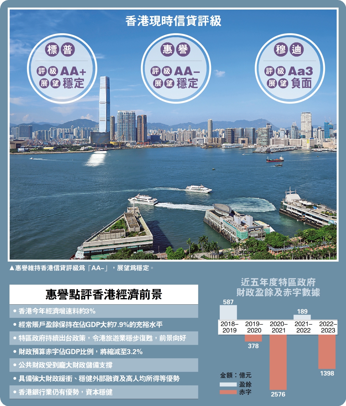 國際評級機構惠譽評級公布,維持香港長期外幣發行人違約評級為「AA-」,展望為穩定。惠譽指出,香港評級受到強大的財政緩衝、穩健的外部融資及高人均所得支撐,但特區政府財政恢復至收支平衡狀況,仍要需時數年,將進一步削弱財政緩衝,但不會對香港的信用狀況構成即時壓力。