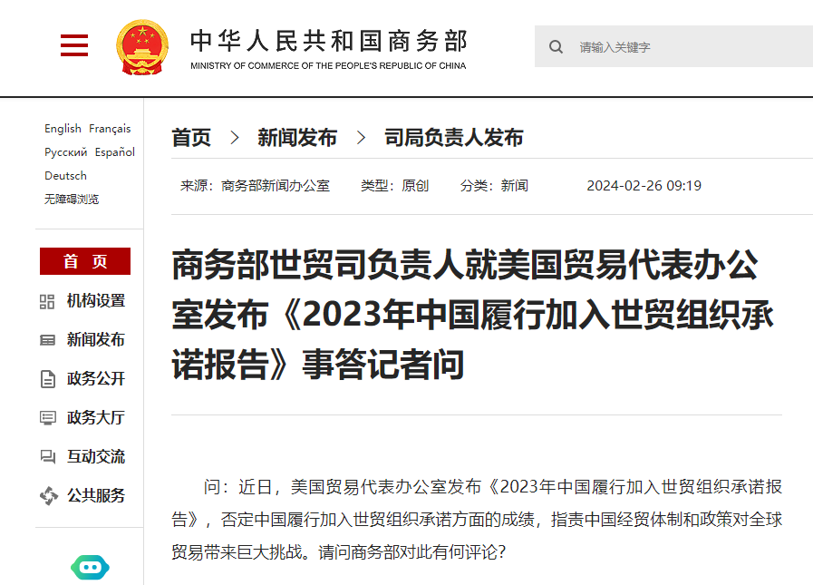 近日,美國貿易代表辦公室發布《2023年中國履行加入世貿組織承諾報告》,否定中國履行加入世貿組織承諾方面的成績,指責中國經貿體制和政策對全球貿易帶來巨大挑戰。對此,商務部發言人回應表示,中方注意到這份報告的不實指責。美方無視中國在履行世貿組織承諾方面取得的巨大成績,歪曲中國社會主義市場經濟建設和改革開放的顯著成就,否認中國對多邊貿易體制和世界經濟發展作出的重要貢獻,以毫無依據的武斷標準指責中國經貿政策,妄稱中國正當貿易措施為「經濟脅迫」,顛倒黑白,對中方因美方封鎖打壓而採取的應對舉措扣上「主動脫鈎」的帽子,誣稱中方造成「產能過剩」,充分反映了美方的單邊主義和霸凌行徑。中方對此堅決反對。