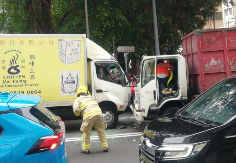 【點新聞報道】西環發生交通意外。事發今早(28日)7時許,一輛密斗貨車沿域多利道東行,當駛至近百年大樓對開交通燈位時,對面一輛運載垃圾的貨車沿域多利道西行懷疑越線,與密斗貨車迎頭相撞。垃圾車男司機腳部骨折,一度被困車上,其後由救援人員救出,清醒送往瑪麗醫院治理。密斗貨車男司機則報稱扭傷頸及腰痛,同需送院治理。