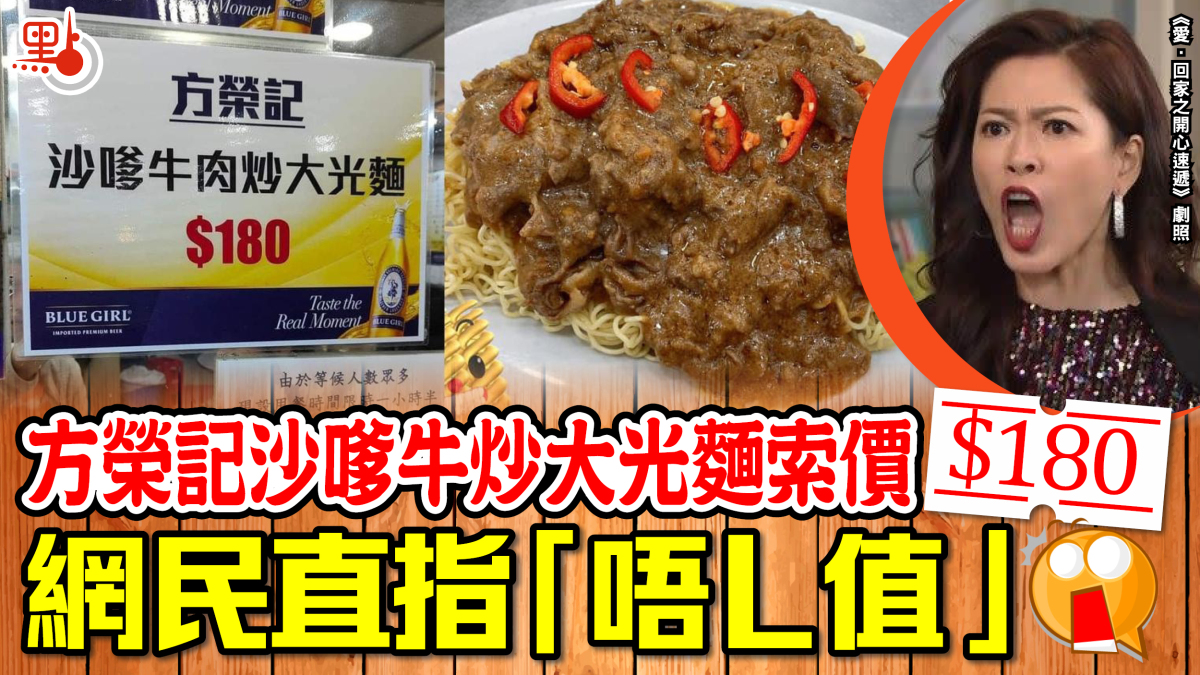 九龍城方榮記,早前因食物水準參差、衞生環境惡劣、服務態度差,惹來內地旅客負評。昨日,有網民在社交平台貼出方榮記「沙嗲牛炒大光麵」要價180元的照片,旋即在各討論區瘋傳,不少網民認為這個價錢可以好多選擇,直指「唔L值」、「水魚」、「食嗰個真係on X」,「呢啲舖頭就準備執笠得啦」、「唔番大陸消費有鬼,咁喇貴!」