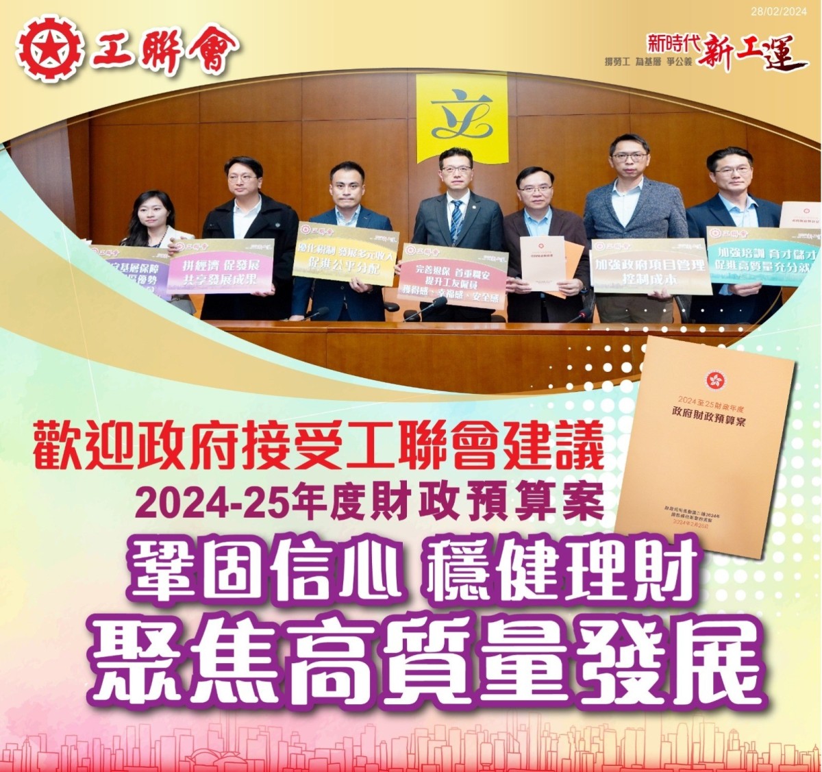 【點新聞報道】財政司司長陳茂波今日(28日)發表新一份財政預算案,工聯會肯定政府「鞏固信心 穩健理財 聚焦高質量發展」的施政方向,認同政府以開源節流應對財政赤字,但強調對基層,特別是長者的福利惠民政策上,不能削減。總括而言,應穩健腳步,聚焦高質量發展。