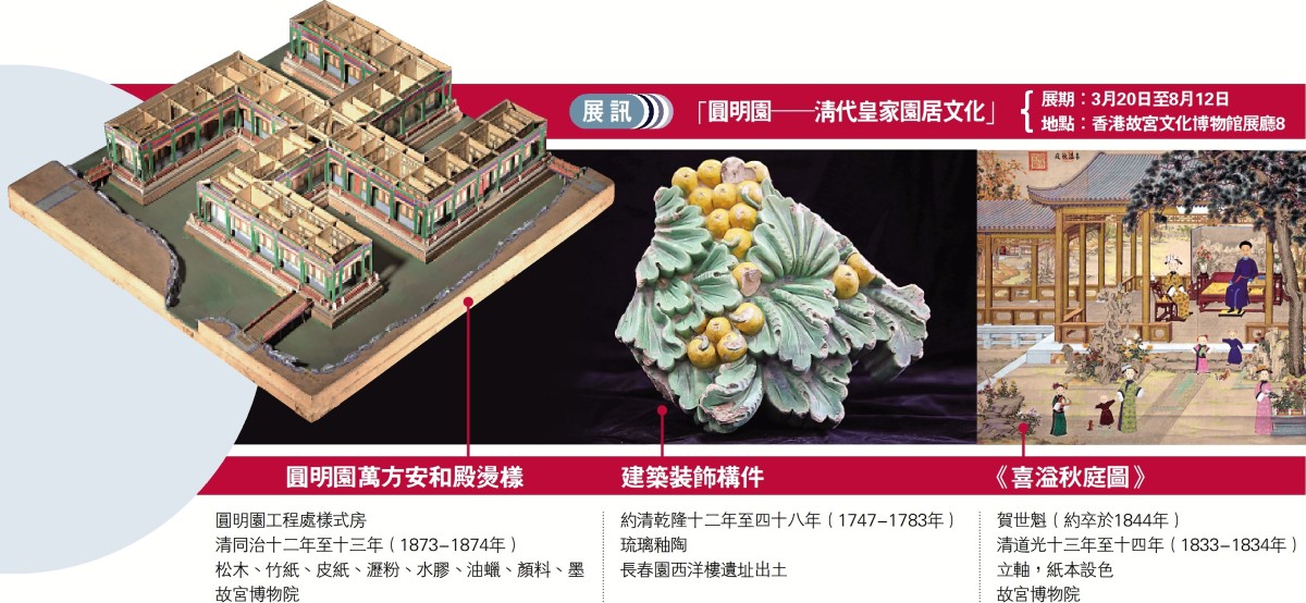 「圓明園──清代皇家園居文化」展覽介紹園林布局的象徵涵義、時令節慶的豐富活動,以及皇室成員的園居故事和藝文雅趣。展覽全面呈現圓明園的面貌,讓觀眾對中國園林藝術有更深入的了解。門票3月1日起開售。