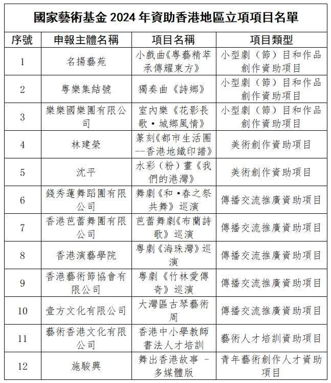 【點新聞報道】國家藝術基金管理中心今日(3月1日)公示了國家藝術基金(一般項目)2024年資助項目名單,其中香港特區有12個藝術機構、藝術工作者的申報項目入選,創3年來新高。2024年度香港入選項目,包括小型劇(節)目和作品創作項目3項、美術創作項目2項、傳播交流推廣項目5項、藝術人才培訓項目1項、青年藝術創作人才項目1項。