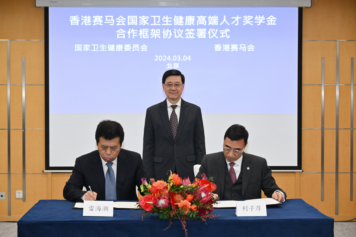 之後,李家超出席國家衞生健康委員會、醫務衞生局和香港賽馬會的合作文件簽署儀式,見證香港賽馬會分別與國家衞生健康委員會簽署《香港賽馬會國家衞生健康人才能力建設項目》合作備忘錄和《香港賽馬會國家衞生健康高端人才獎學金》合作框架協議,以及與醫務衞生局簽署《醫務衞生局與香港賽馬會本地傳染病預防及應對項目》合作備忘錄。