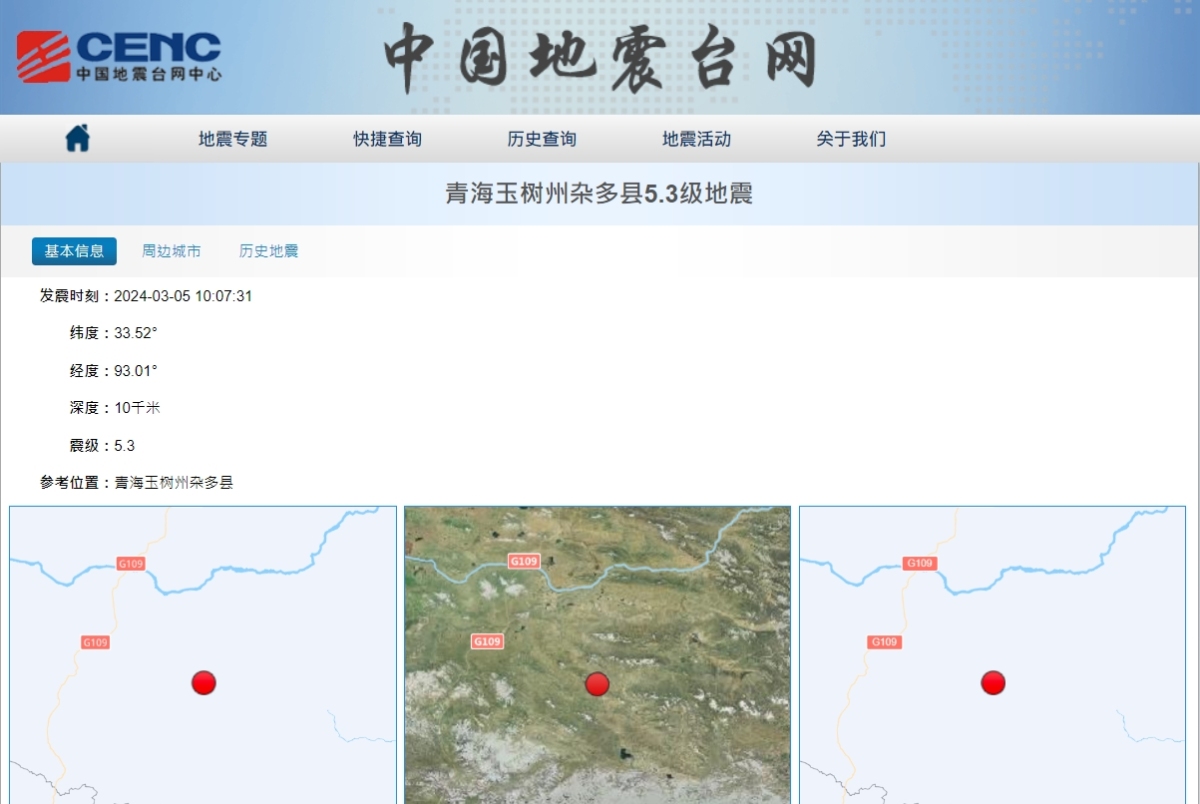 【點新聞報道】中國地震台網正式測定,青海玉樹州雜多縣(北緯33.52度,東經93.01度)今日(5日)上午10時7分發生5.3級地震,震源深度10公里。