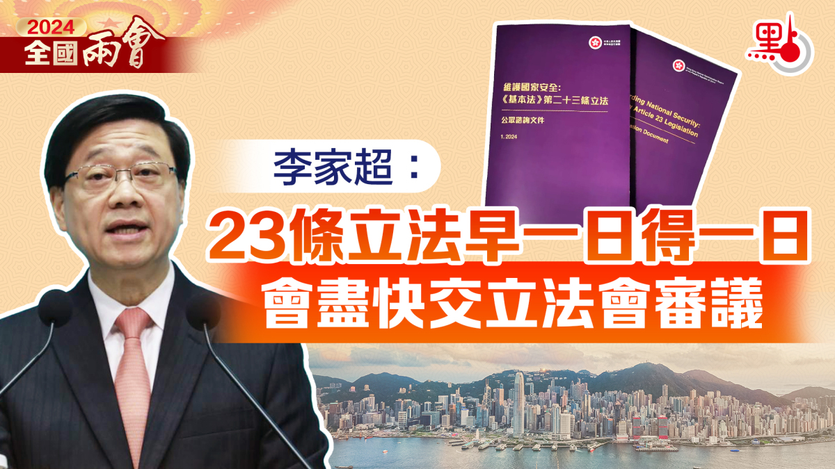 【點新聞報道】十四屆全國人大二次會議今日(3月5日)上午在北京開幕,李家超以香港特別行政區行政長官身份列席開幕會。李家超今日下午在北京見記者時表示,政府會盡快將23條的立法工作完成,早一日完成,就令到國家安全更加早一日獲得很好的維護。
