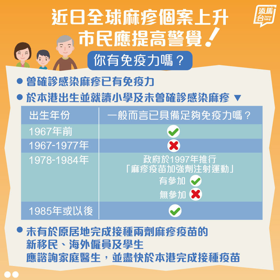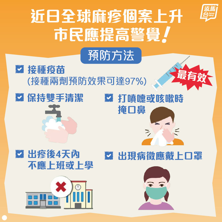政府指出,接種疫苗是預防麻疹最有效方法,接種兩劑疫苗後預防效果可達97%。政府補充,少數於本港出生而未完成接種兩劑麻疹疫苗的人士,可向醫生諮詢接種麻疹疫苗的建議。因應海外的麻疹疫苗接種覆蓋率,未有於原居地完成接種兩劑麻疹疫苗的新移民、海外僱員及學生應諮詢家庭醫生,並盡快於本港完成接種麻疹疫苗。