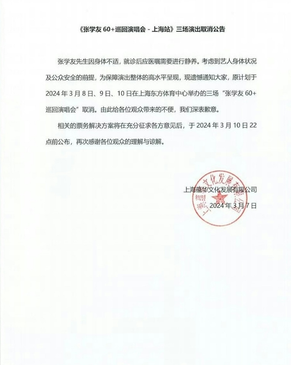 7日,張學友因身體不適在上海就醫,病因疑為上呼吸道感染。演唱會主辦方在微博發聲明:「張學友先生因身體不適,就診後應醫囑需要進行靜養。考慮到藝人身體狀況及公眾安全的前提,為保障演出整體的高水準呈現,現遺憾通知大家,原計劃於2024年3月8日、9日、10日在上海東方體育中心舉辦的三場《張學友60+巡迴演唱會》取消。由此給各位觀眾帶來的不便,我們深表歉意。」