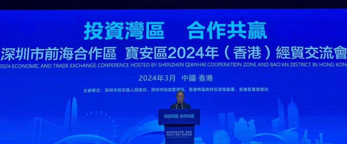 【點新聞報道】政制及內地事務局局長曾國衞今日(8日)出席「投資灣區 合作共贏」深圳市前海合作區·寶安區2024年(香港)經貿交流會,他在致辭時指,前海擴區後,範圍涵蓋了寶安區內多個重點發展區域,去年寶安區的經濟發展強勁,地區生產總值超5000億元人民幣,增長率達8.5%。