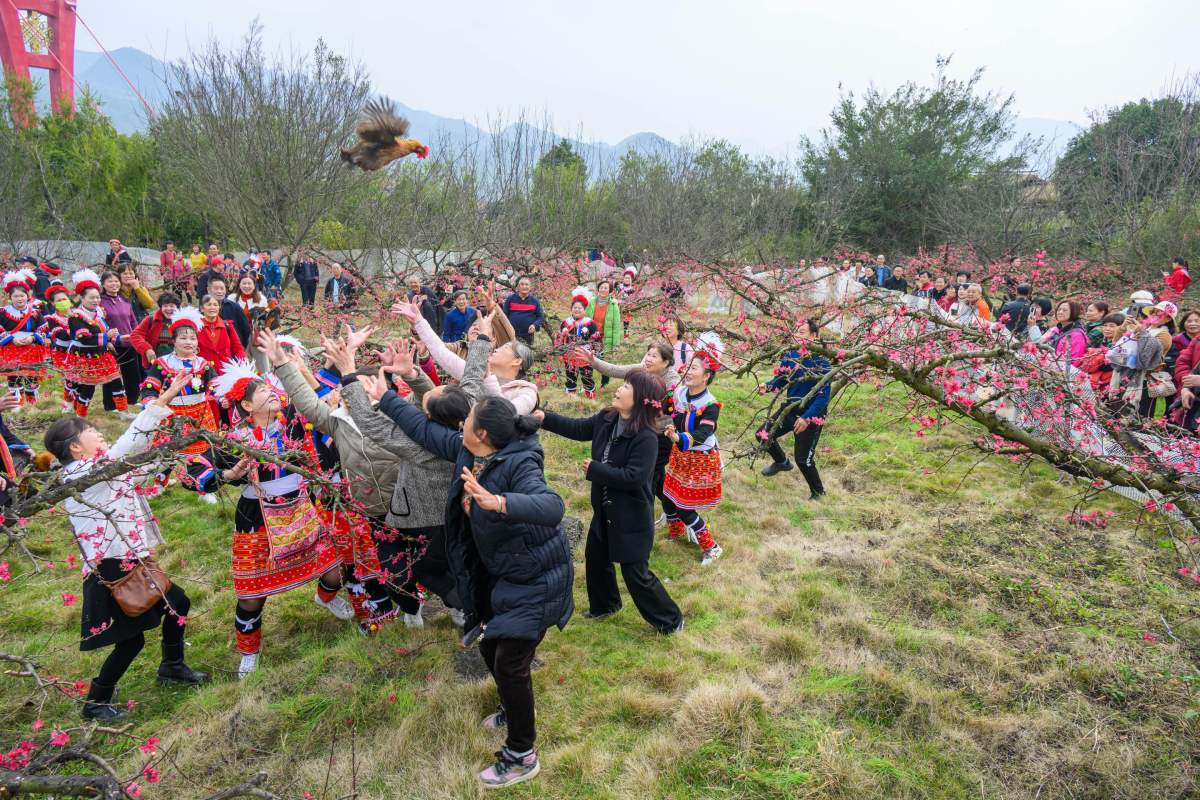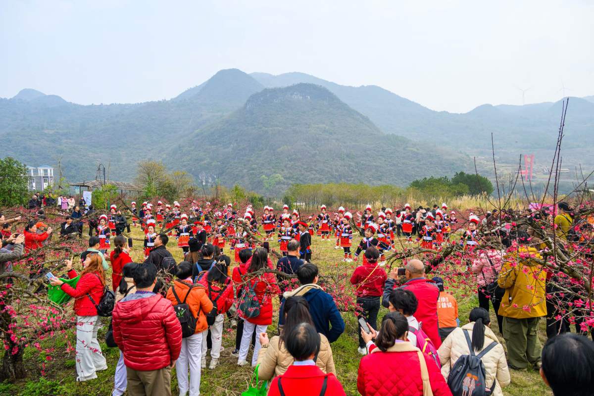 桃花作為連州「市花」,其花期長達30天之久,在連州已形成「水陸空」立體觀賞格局。據悉,本次旅遊季活動現場不僅開展「桃園抓雞」活動讓遊客們體驗一把「桃花樹下抓土雞」的樂趣,而且上演廣東省級非遺項目《瑤族布袋木獅舞》和清遠市級非遺項目《唱春牛》表演,還布置特色市集,匯聚有連州非遺美食、東陂臘味、洞藏黃精酒、「五大百億農業產業」農產品等展位。而百人齊跳「科目三」舞蹈表演也分別在湟川三峽遊船、桃花園、擎天玻璃橋三個場景登場,掀起旅遊季首輪熱潮。