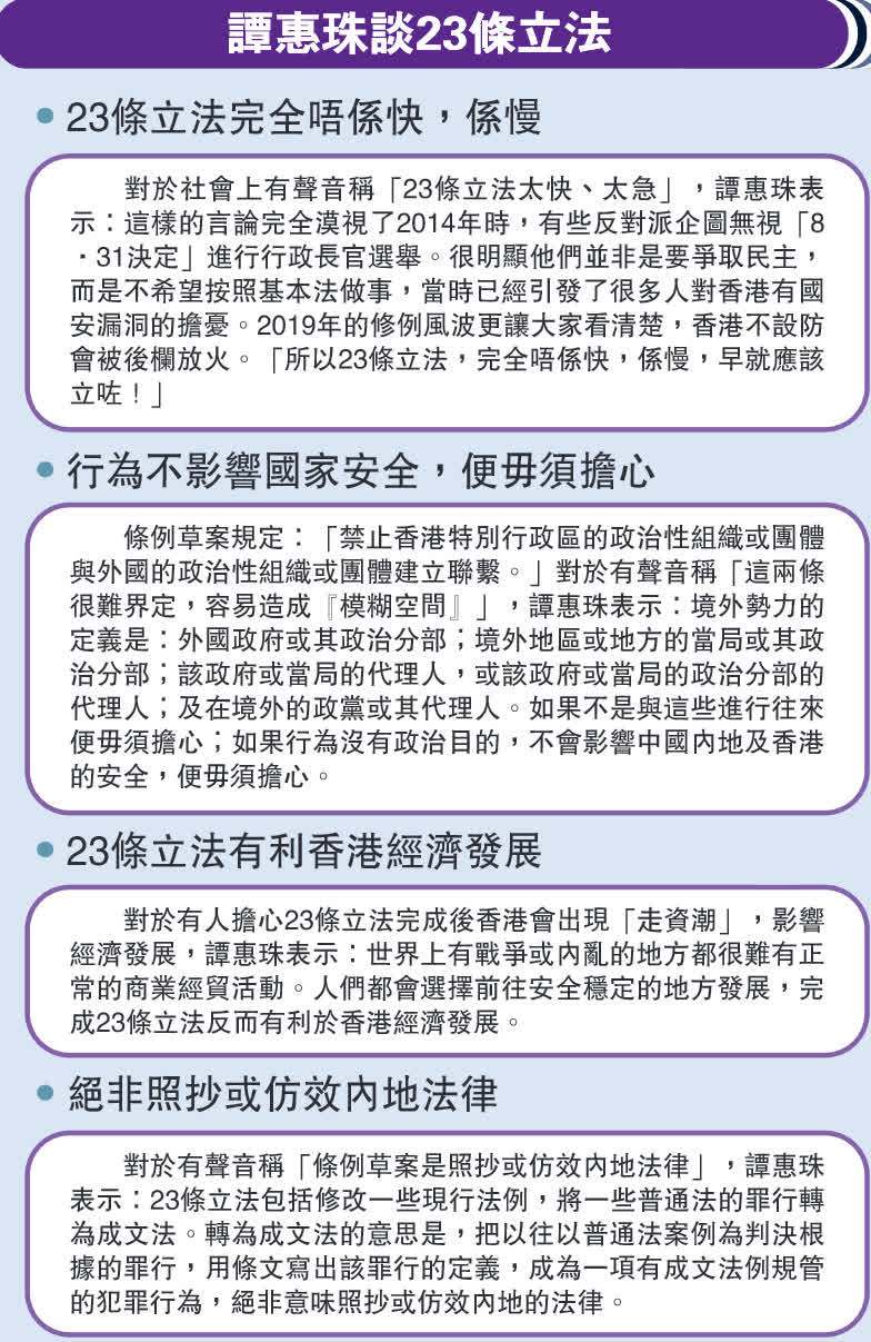 對於有聲音指立法過快、過急,譚惠珠反駁,2014年的非法「佔中」已經有一股力量不希望按照《基本法》規定進行行政長官選舉,令普選亮起紅燈;2019年的顏色革命更讓市民清楚看到如果香港不設防,就會有人利用漏洞危害國家安全,因此23條立法早已刻不容緩。