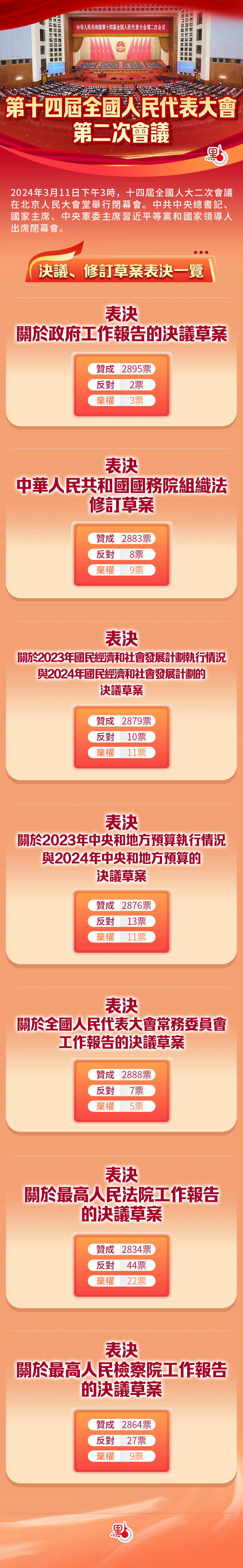 【點新聞報道】2024年3月11日下午3時,十四屆全國人大二次會議閉幕會在人民大會堂舉行。會議表決通過了:
