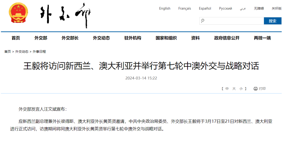 據外交部網站消息,外交部發言人汪文斌宣布,應新西蘭副總理兼外長彼得斯、澳大利亞外長黃英賢邀請,中共中央政治局委員、外交部長王毅將於3月17日至21日對新西蘭、澳大利亞進行正式訪問,訪澳期間將同澳大利亞外長黃英賢舉行第七輪中澳外交與戰略對話。