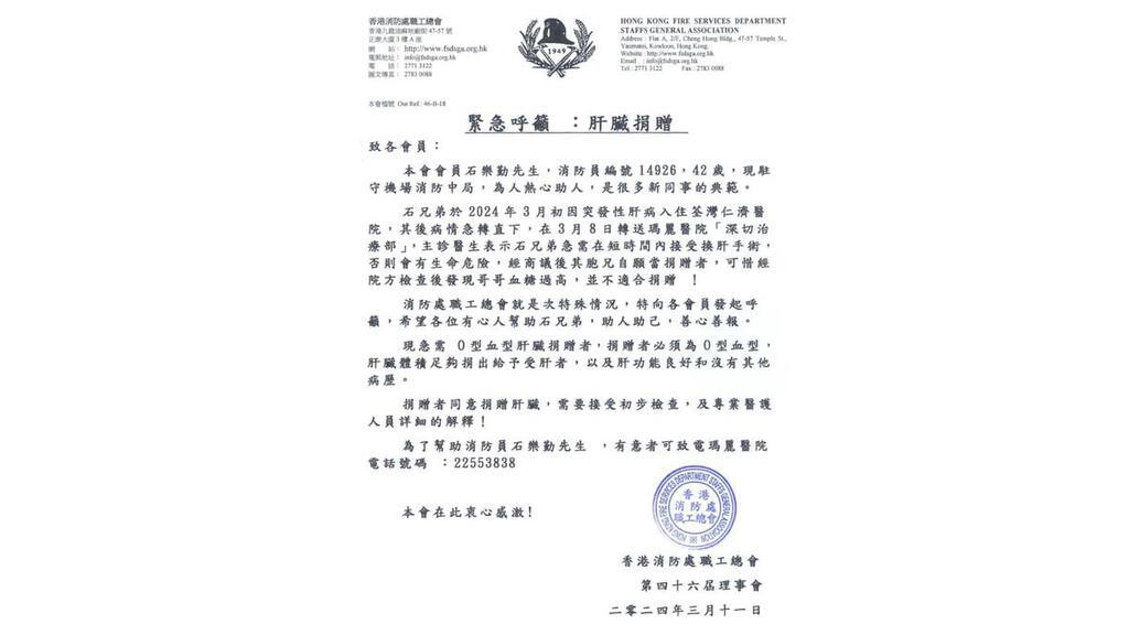 【點新聞報道】消防員石樂勤為人熱心助人,3月初患突發性肝病入院,急需在短時間內接受肝臟移植。消防處職工總會今日(15日)發起緊急呼籲,希望O型血市民能夠捐肝,協助他續命。