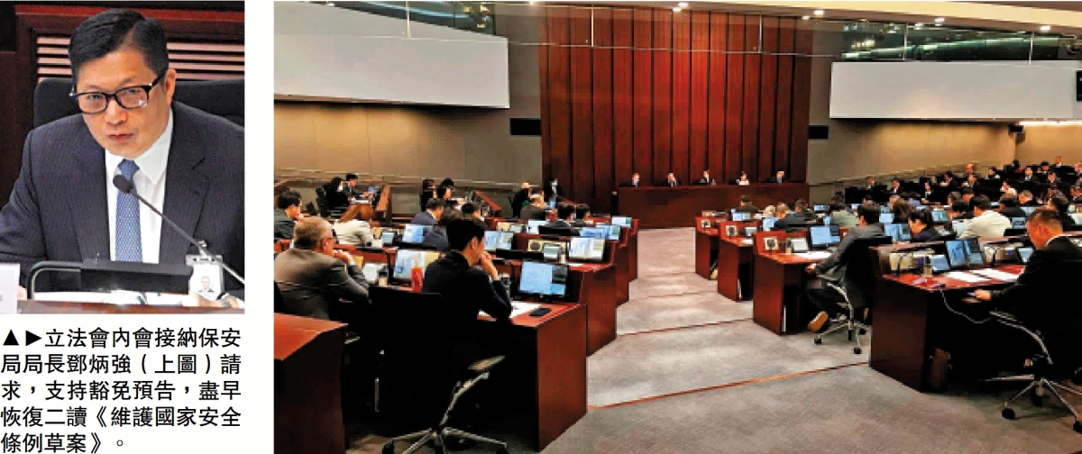 立法會法案委員會14日完成審議基本法23條立法相關草案的工作,保安局局長鄧炳強昨日去信內務委員會主席李慧琼,尋求內委會支持他向立法會主席請求批准豁免所需預告,讓條例草案能在最早而可行的日子納入立法會會議議程,盡早恢復二讀辯論。內務委員會昨日下午舉行會議,委員會一致同意鄧炳強的建議,並將議員提交修正案的時限,定在今日(16日)中午12時前。