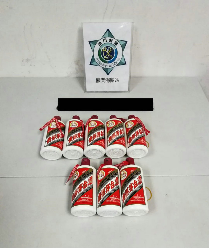 昨日下午,海關人員於關閘口岸出境旅客檢查區發現一名通關香港女子肢體僵硬,步履異常,懷疑其身上藏有可疑物品。經使用太赫茲人體成像安檢系統詳細檢查後,發現該名女子將八支市值逾20,000澳門元茅台綁藏於大腿及小腿,試圖偷運出境。