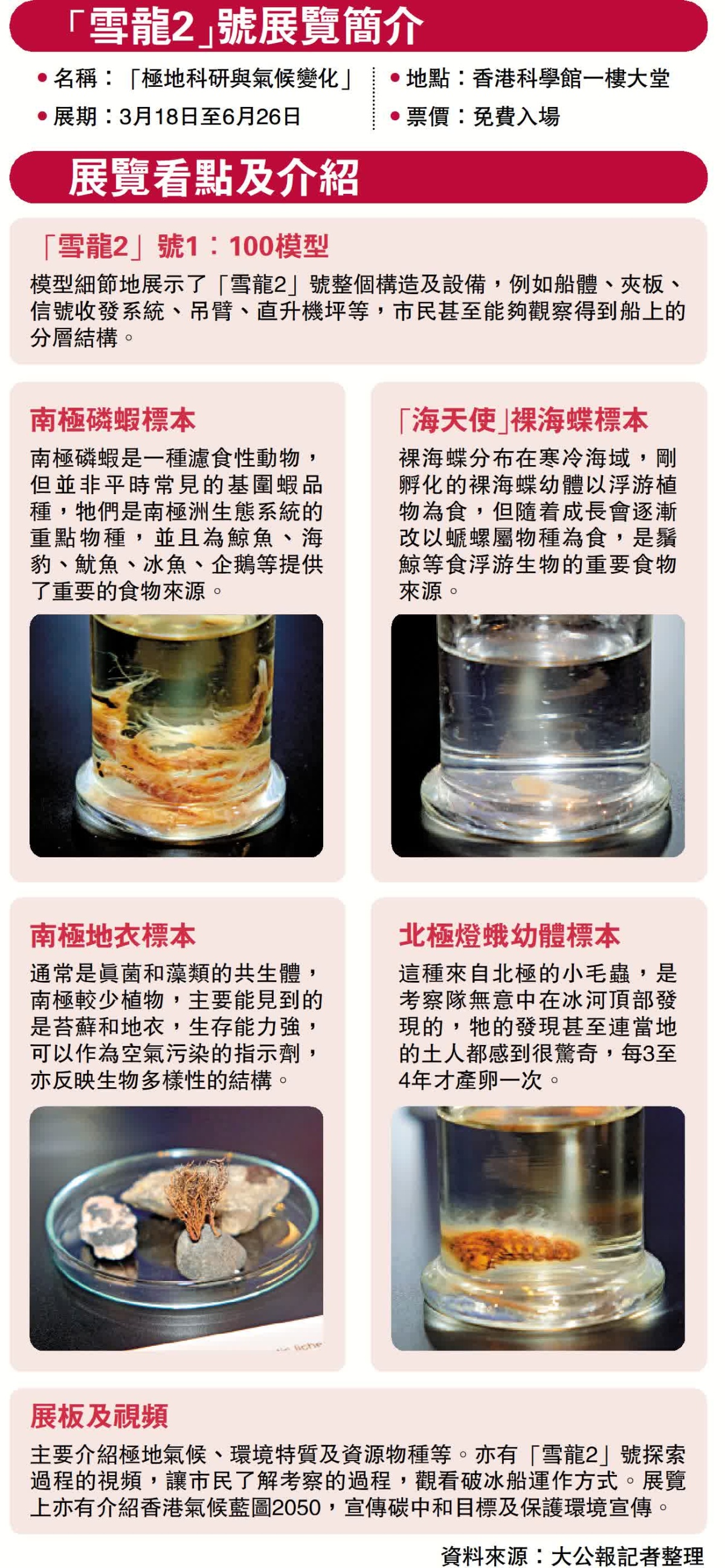 展覽亦展示了破冰船在兩極搜集到的珍貴生物標本,包括南極磷蝦、地衣、「海天使」裸海蝶,以及極為少見的北極燈蛾幼蟲等,參觀者能近距離觀賞。