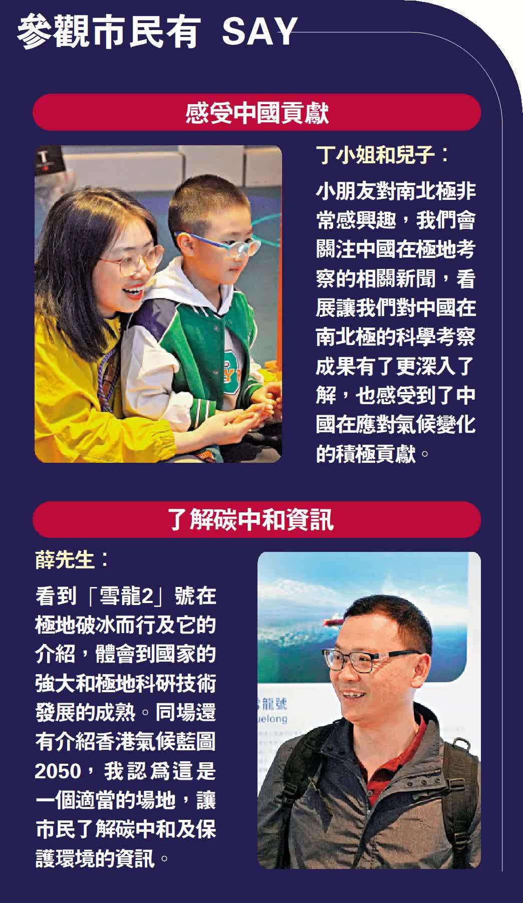 有市民帶同孩子一起看展覽,認為展覽極具教育意義,能讓孩子認識科學及環保;有市民認為展覽令他更體會到國家極地科研的實力,亦讓參觀者認識更多碳中和及保護環境資訊。