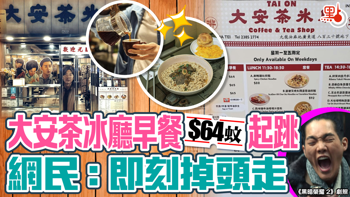 網民在fb群組「香港茶餐廳及美食關注組」上載數張大安茶冰廳貼在門口的餐牌,寫道「即刻掉頭走」。從相片可見,早餐、常餐和下午茶,食物售價普遍高於一般茶餐廳,早餐乎64至78元;常餐就介乎88至98元,下午茶則由58起跳至78元。